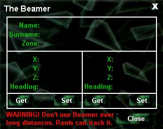 About:Yes you now can beam, not with the grafical- and sound-effects of the Enetrprise but you can now beam!This function is really powerful if you need an emergencyexit. You just seek after your chars name and EverHackreads your actual locs out (e.g. at zone) than younormally play the game and if you think, oh damn now Idie again you press the "Backup"-button and you willbe auomatically transported to the last position yousaved you locs!And if you know what you do, you just enter new locsmanually and will be beamed to that position! But be CAREFUL, you can be traced if you make a beam over a long distance, so only make some small beam for that you can say that you have had a lag at the time.